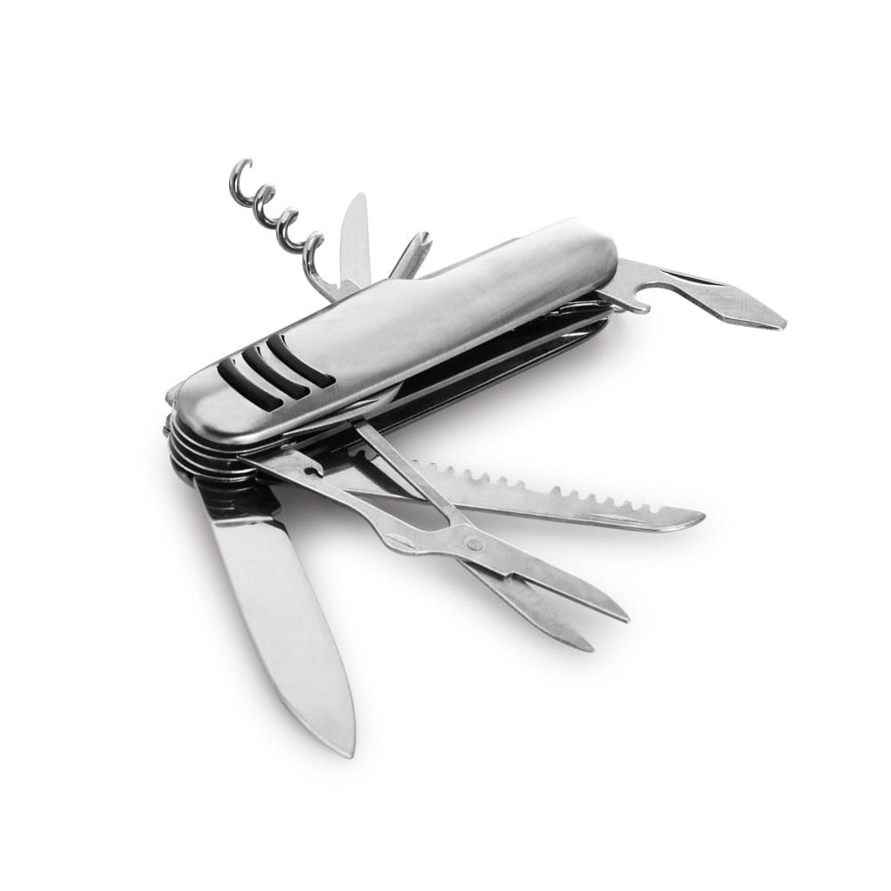 Zestaw dla aktywnych. Stal nierdzewna, metal i aluminium. Zawiera nóż wielofunkcyjny (11 funkcji) oraz latarkę (dołączone 3 baterie AAA). Dostarczane w etui z materiału 600D. Etui: 84 x 120 x 25 mm
