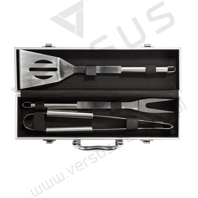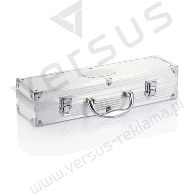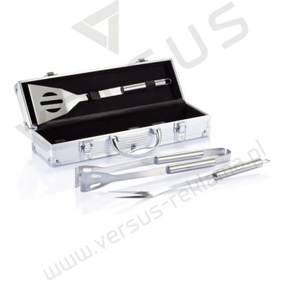 Zestaw narzędzi ze stali nierdzewnej do grilla: szpatułka, widelec z pokrywami ochronnymi i parą szczypiec, uchwyty ze stali nierdzewnej, w pudełku aluminiowym.