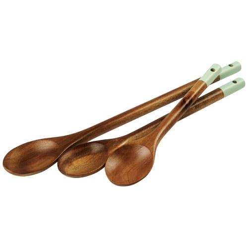 3-elementowy zestaw drewnianych łyżek Altus. Zestaw 3 drewnianych łyżek akacjowych - mała, średnia i duża. Funkcjonalne i ozdobne z końcówkami pokrytymi farbą w kolorze miętowym. Idealne do mieszania i łączenia dowolnych składników od masy ciasta po risotto. Drewno akacjowe.