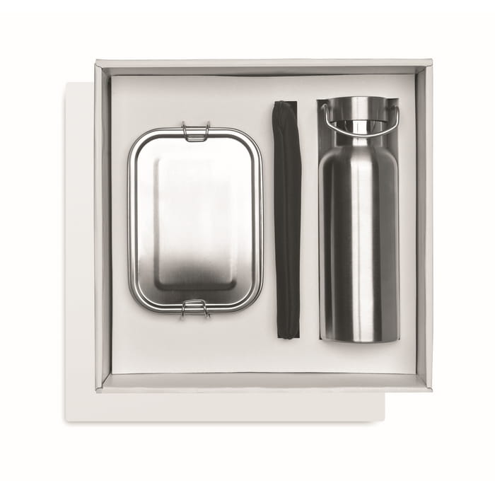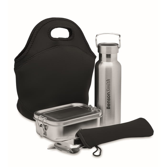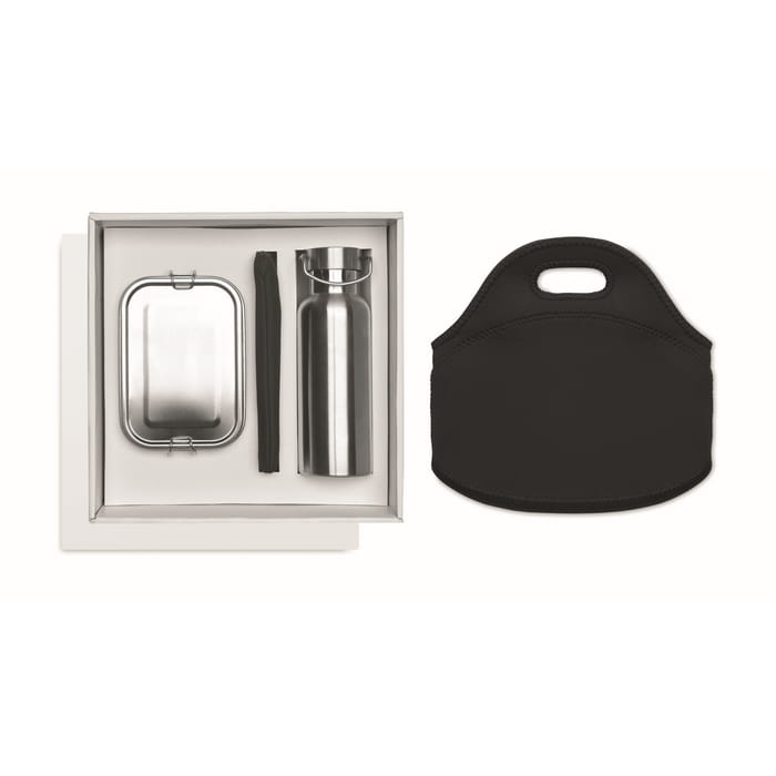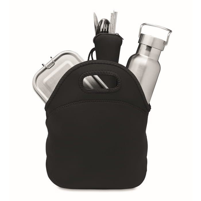 Zestaw lunchowy zawierający butelkę próżniową z podwójną ścianką ze stali nierdzewnej (500 ml), lunchbox (600 ml) i sztućce w zapinanej na zamek neoprenowej torbie.