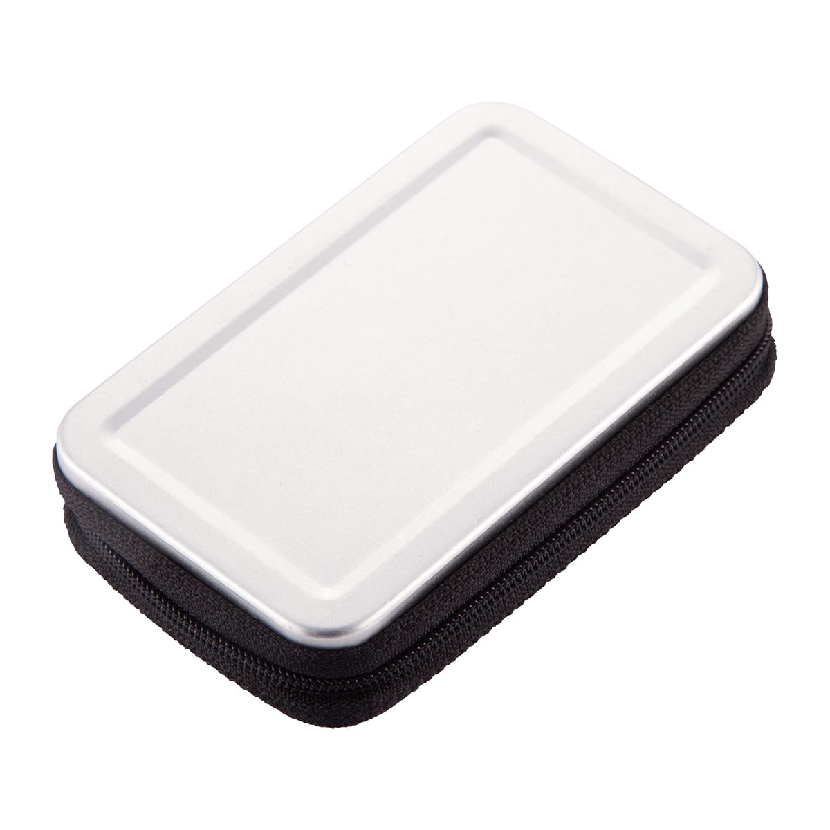 Zestaw narzędzi w metalowym pudełku zasuwanym na zamek. Zestaw składa się z 6 wkrętaków o podwójnym zakończeniu. W ich skład wchodzą: 4 końcówki imbusowe, 4 płaskie śrubokręty, 4 śrubokręty krzyżowe oraz 3 klucze imbusowe i uchwyt.