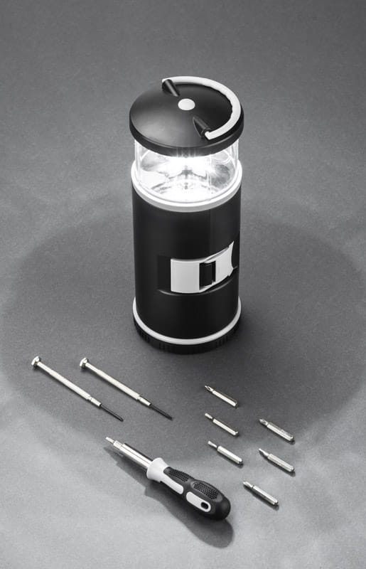 Zestaw narzędzi BARTO to zestaw w kształcie latarni zawierający śrubokręt z 8 bitami, 2 śrubokręty precyzyjne i lampka LED, pełniąca ciekawą funkcję lampki kempingowej. Posiada uchwyt do zawieszenia lub przenoszenia. Lampka jest zasilana bateriami 3xAAA. Baterie nie są dołączone.