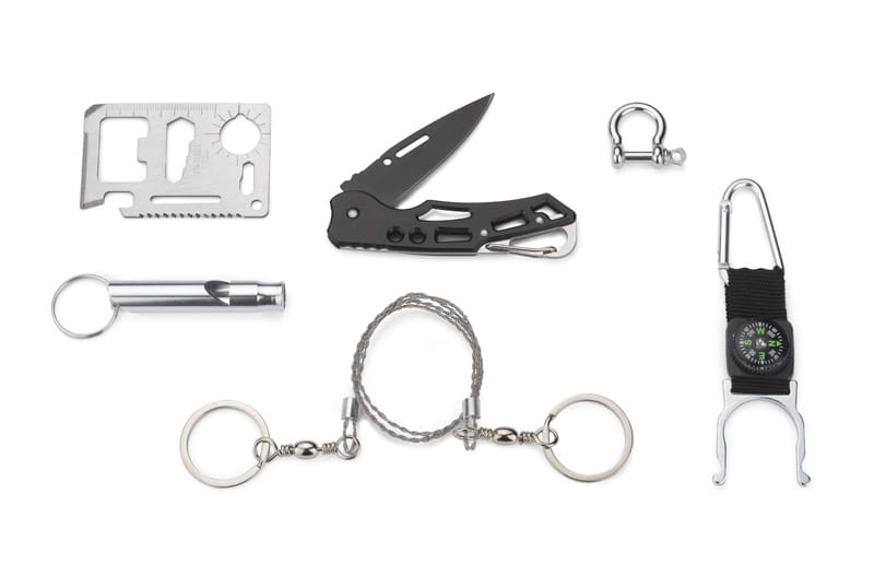 Zestaw outdoor BALE to gratka dla miłośników survivalu. W jednym zestawie znajdziemy wszystko co sprawdzi się podczas niejednej wyprawy. Zestaw składa się z sześciu elementów: uchwytu na butelkę z karabińczykiem i kompasem, ręcznej piły łańcuszkowej, składanego noża, gwizdka, szekli żeglarskiej i karty survivalowej która posiada aż 11 funkcji: otwieracza do puszek, butelek, śrubokrętu, linijki 4cm, klucza czteropozycyjnego do różnych rozmiarów nakrętek czy śrub, otwieracza motylkowego, piłki dwurzędowej, wskaźnika mapowego, klucza dwupozycyjnego i otworu na smycz lub kółko do kluczy. Zestaw pakowany jest w czarne etui.