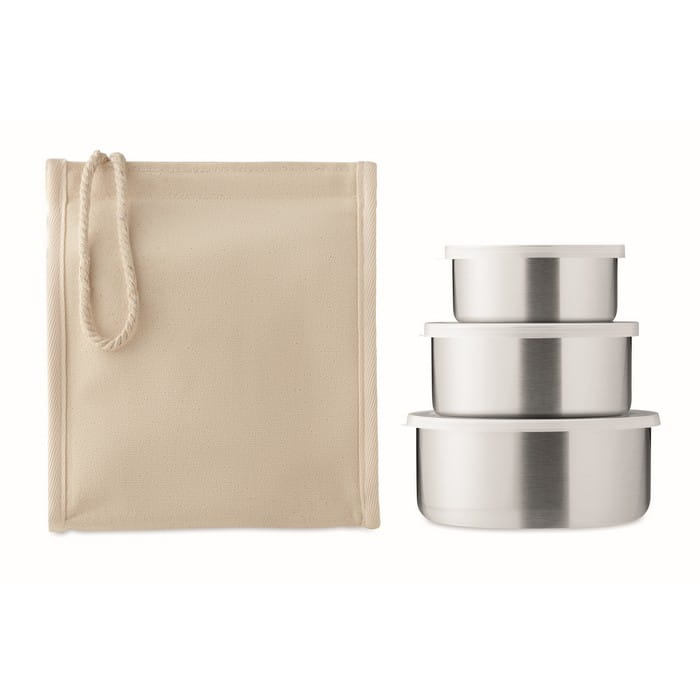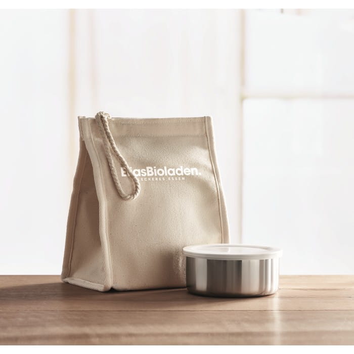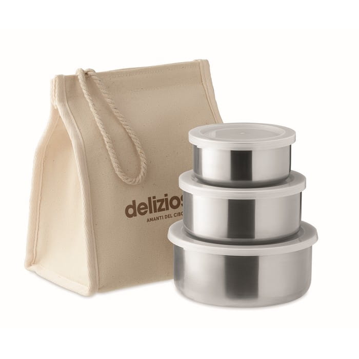 Lunch boxy ze stali nierdzewnej lub zestaw do przechowywania z torbą izotermiczną bawełnianą z zamknięciem na rzep. Materiał izolacyjny: wewnętrzna srebrna folia aluminiowa i sznurek. Pojemność: 300 ml, 500 ml i 750 ml.