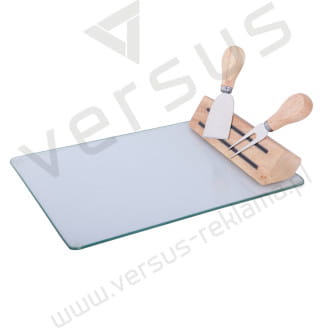 Zestaw składający się z noża i widelczyka ze stali nierdzewnej (rączki z drewna kauczukowego) mocowanych na magnes oraz deski krojenia ze szkła hartowanego, przyjaznego dla zdrowego serwowania posiłków. Zestaw pakowany w czarne opakowanie kartonowe.