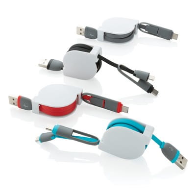 Zwijany, płaski kabel do ładowania i synchronizacji 3 w 1 z końcówkami: USB, typu C i 2 w 1 (micro USB oraz kompatybilną z urządzeniami iOS), obudowa wykonana z ABS, kabel z TPU, długość po rozwinięciu 1 m
